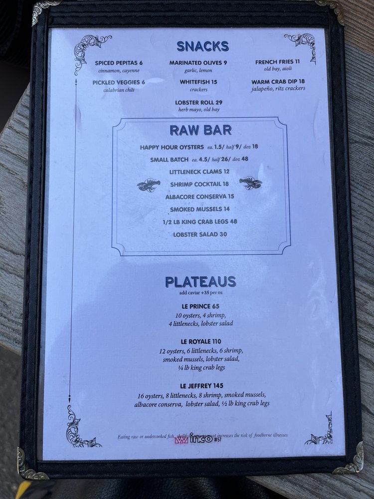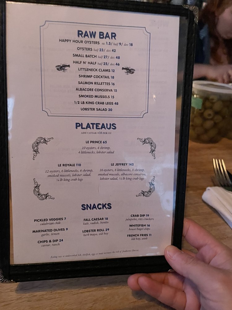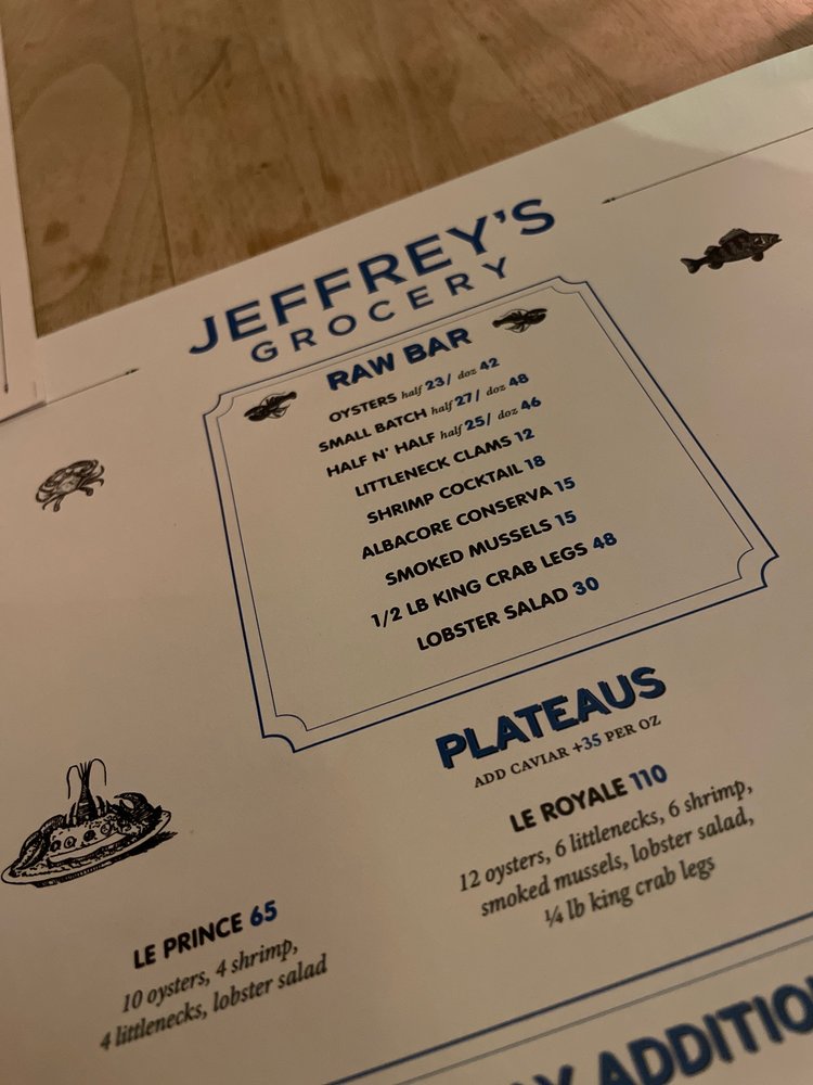 Jeffrey's Grocery in New York's West Village offers a maritime-themed atmosphere with a focus on seafood and cocktails. Customers rave about the attentive and friendly service, highlighting the quick and friendly staff. The menu boasts a variety of must-try dishes such as old bay fries, mussels, oysters, crab dip, and Caesar salad. The lobster roll is a standout with a generous serving of meat and creamy texture. The oyster happy hour, offering 12 high-quality oysters for a deal, is a favorite among patrons. The outdoor seating provides excellent people-watching opportunities in the charming neighborhood. Overall, Jeffrey's Grocery is a gem with mouthwatering offerings and exceptional service, making it a top recommendation for those looking for a delicious seafood dining experience in New York City.